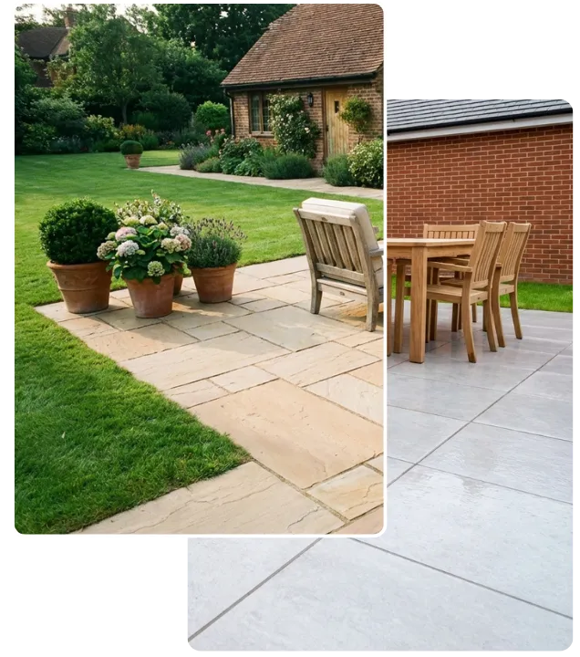 Natural stone patios offer a more traditional and characterful finish. Materials such as sandstone, limestone and slate bring texture and variation, making them a strong choice for period homes and gardens that need a softer, more established look.